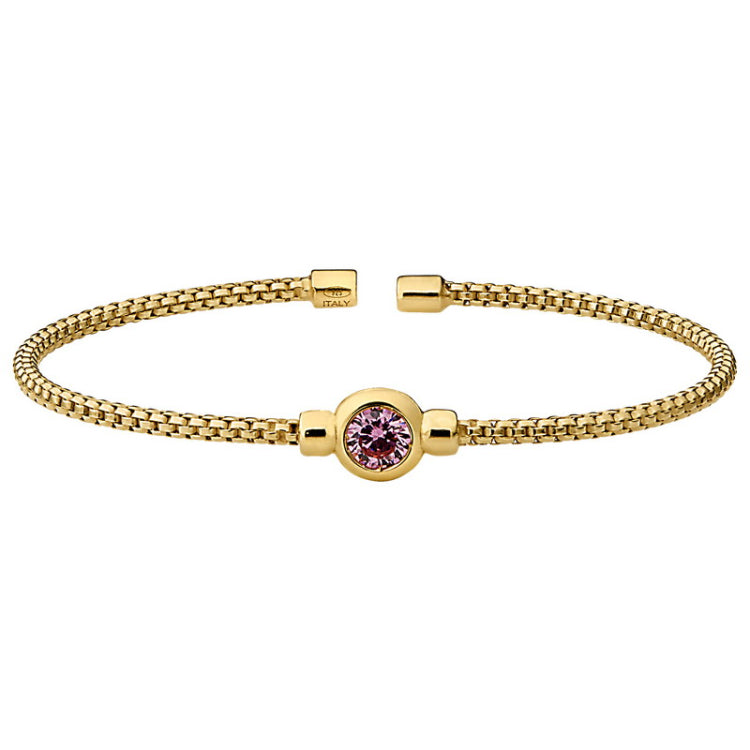 Gold finish sterling silver rounded box link cuff bracelet with bezel set simulated pink sapphire birth gem