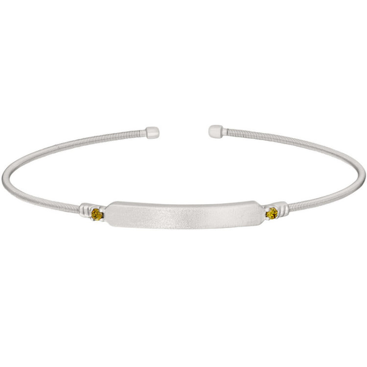 Rhodium finish sterling silver cable cuff bracelet with name plate and simulated peridot birth gems - august
