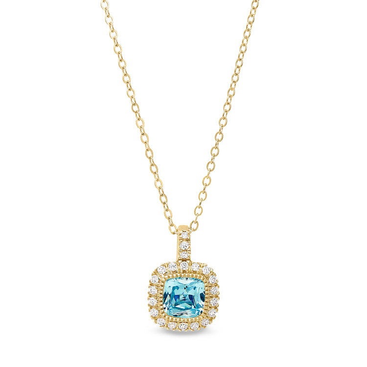 Gold finish sterling silver micropave simulated aqua marine pendant with simulated diamonds on 18 cable chain