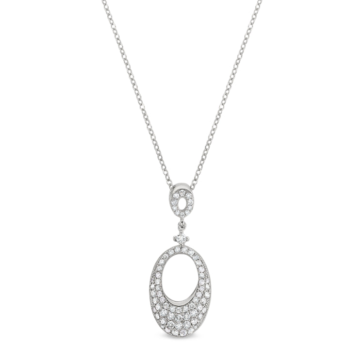Platinum finish sterling silver micropave graduated open oval pendant with simulated diamonds on 18 cable chain