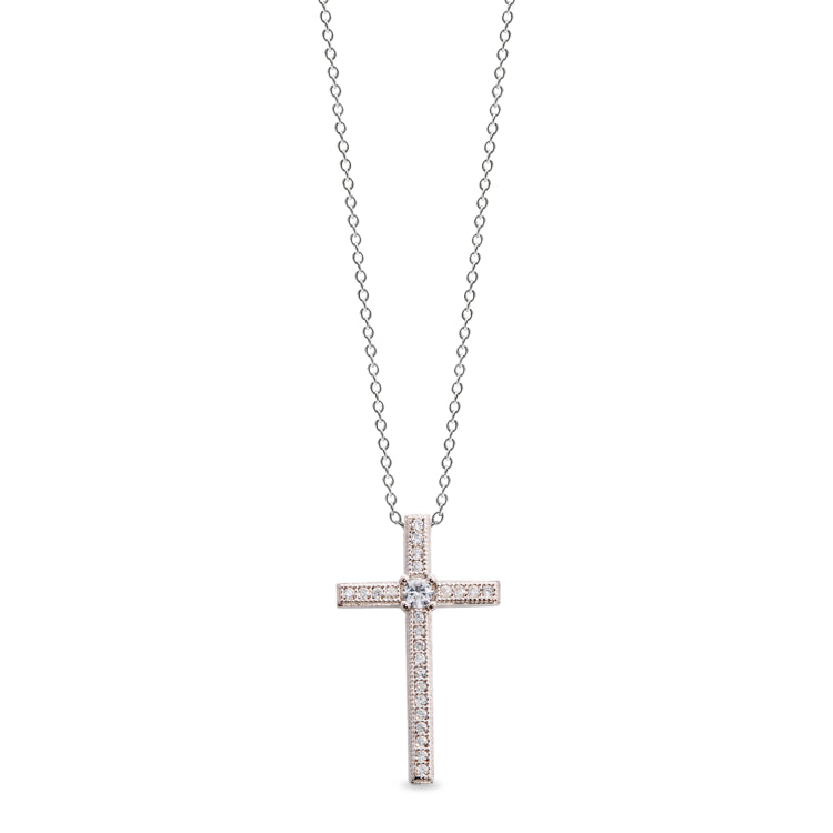 Platinum finish sterling silver micropave thin cross pendant with 65 simulated diamonds on 18 cable chain