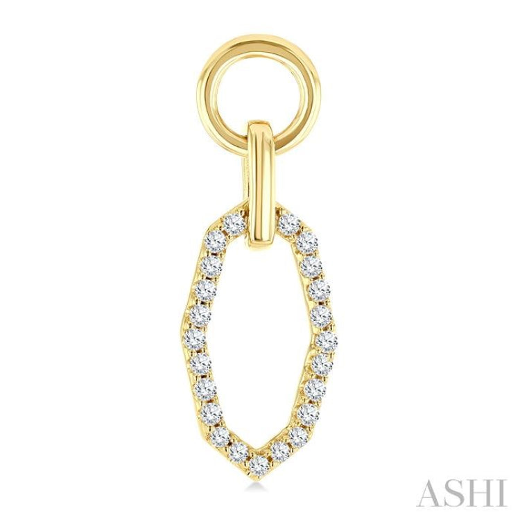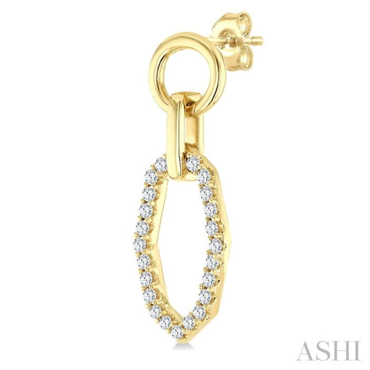 Modern geometry meets timeless sparkle in these sleek diamond fashion earrings. Three distinct open window frames, circle, rectangle, and elongated octagon, cascade gracefully in a vertical drop, each interlocked for fluid movement and visual intrigue. While the upper circle and rectangle are crafted in plain gold, the elongated octagonal frame steals the spotlight, shimmering with 23 prong set round cut diamonds on each earring. A total of 46 diamonds add striking brilliance to the design, which is sculpted in 10 karat yellow gold. Push-back earnut clasps secure the fashion earrings. Total diamond weight is 1/3 ctw.