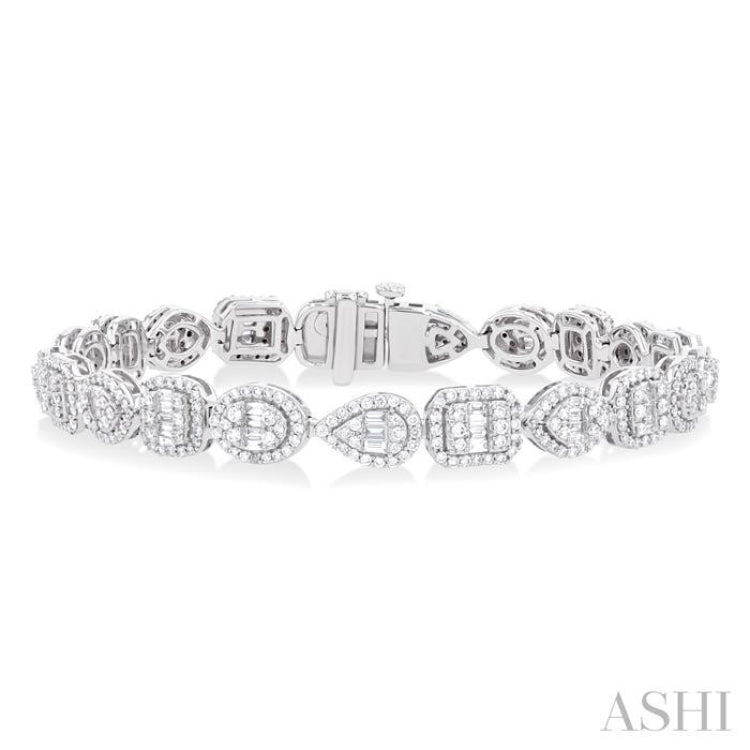 A striking design and majestic layout of diamonds, make this mixed shape halo fusion diamond bracelet a must-have. It features four different shaped mounts, a round, oval, pear and emerald mount, forming a row of four, all the way round the bracelet. Each of these mounts is embellished with a fusion of baguette and round cut diamonds. There are a total of 84 channel set baguette cut diamonds and 538 prong set round cut diamonds haloing and decorating the mounts. An open box clasp with push-release, secures the bracelet. The mixed shape halo fusion diamond bracelet is framed in a rhodium finish 14 karat white gold. The total diamond weight is 3 1/5 ctw.