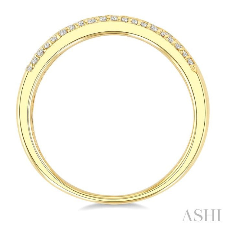 A garden of light, captured in gold, this diamond fashion band brings a poetic touch to everyday elegance. It is a composition of symmetry and spontaneity; elegant, expressive, and effortlessly unique. On the ring top, at the center of the top rim blooms a delicate floral motif, formed by 7 pave hand set round cut diamonds, one in the center, encircled by 6. On either side of this luminous bloom, a twin row of 31 pave hand set round cut diamonds create a radiant band of brilliance, hugging the rim in a mirror-like cascade. For a final flourish, 7 flush set round cut diamonds are artfully scattered across the remaining gold surface in a graceful zig-zag, creating a mosaic-like interplay of sparkle and negative space. The fashion band is styled 10 karat yellow gold. Total diamond weight is 1/4 Ctw.
