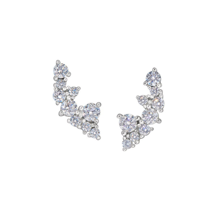 Platinum finish sterling silver climber earrings with a cluster of simulated diamonds